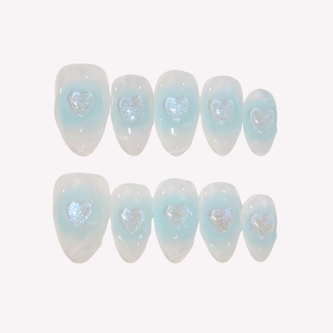 NAIL SHAPE: Short Almond APPROX. LENGTH: 17MM Unveiling Ersa Nails' Blue Heart, an enchanting press-on...