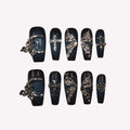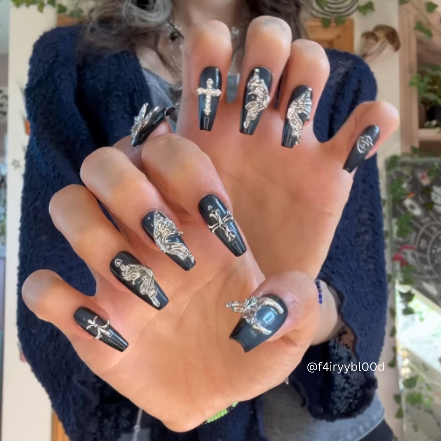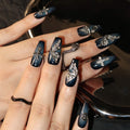 Unveiling Lunar Fantasies, a reflection of ethereal dreams and serene nights. Set against a deep midnight hue, each nail showcases an intricate emblem - from the crescent moon's tender curve,to the delicate wings of a butterfly. This nail set is a testament to life's profound symbols, each carrying its own tale and mystique. Crafted with meticulous attention to detail, the set mirrors Ersa's commitment to narrating stories through exquisite artistry. With Lunar Elegance, you don't just wear nails; you adorn yourself with tales as ancient as time.