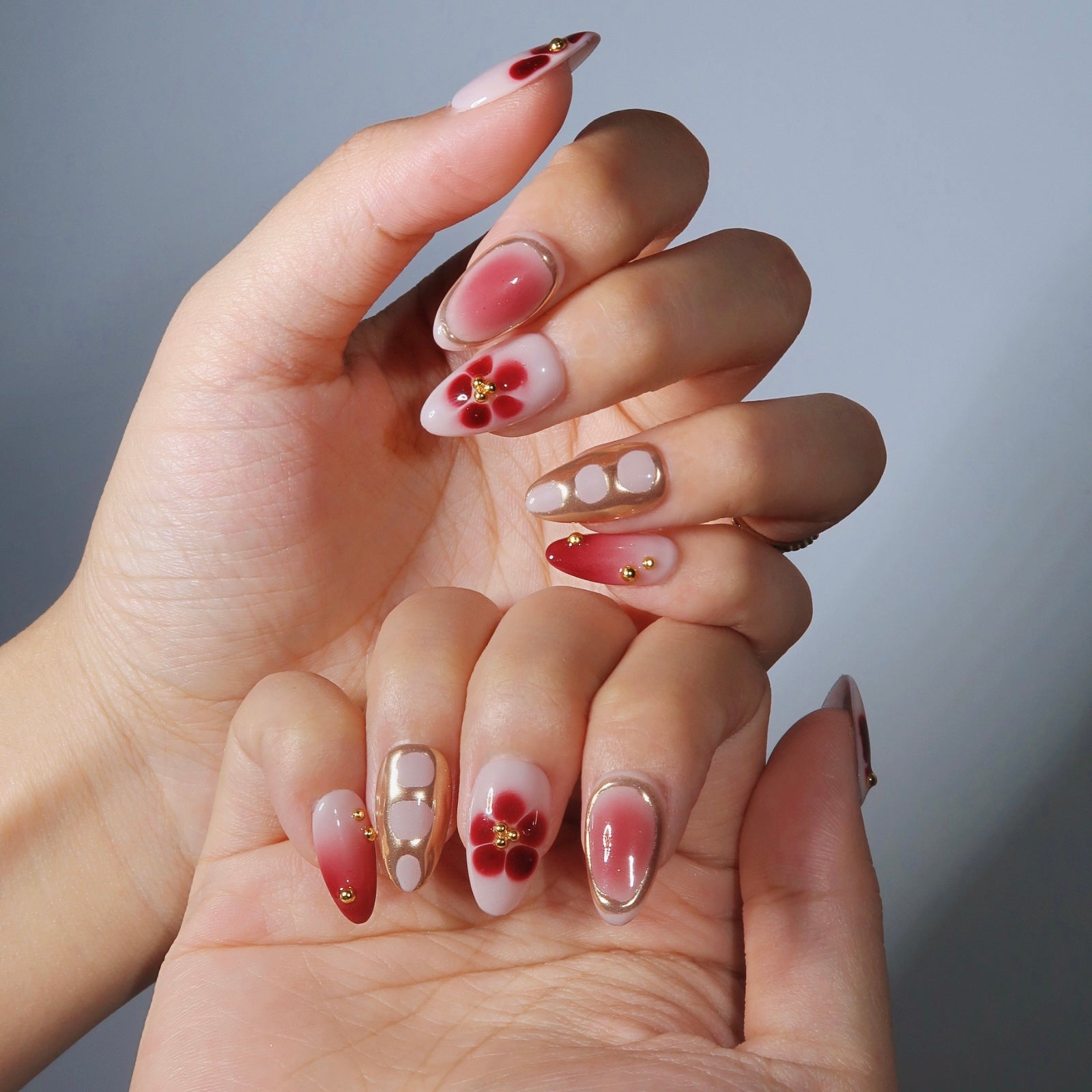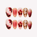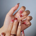 Embrace the cozy vibe of sweater weather with Spiced Bloom by Ersa Nails. This short almond set brings the rich hues of the holiday season to life, featuring bold florals and shimmering gold accents that capture the warmth of festive gatherings and crisp, cool days. Perfect for adding a touch of seasonal elegance, Spiced Bloom is designed to make your nails the highlight of the holiday season.