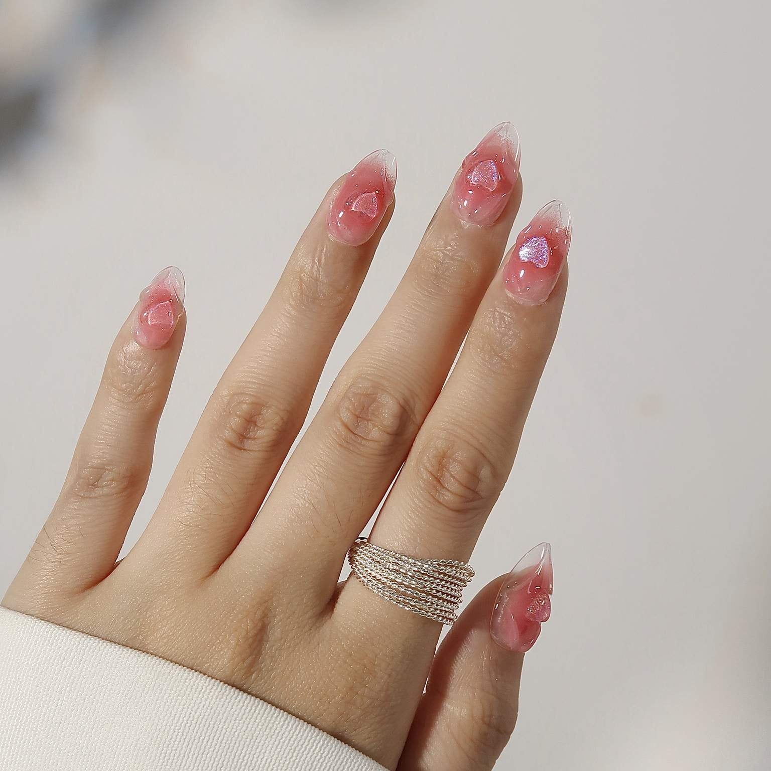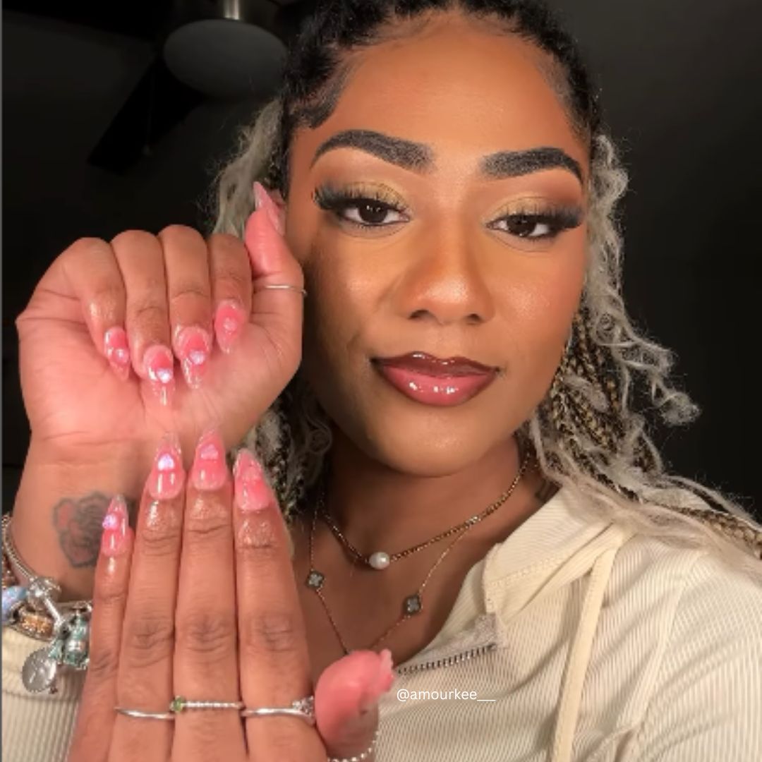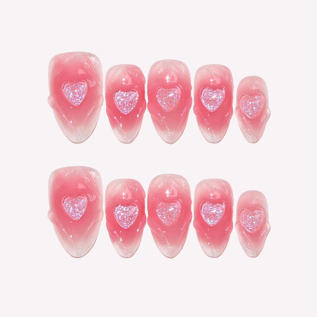 Sweetheart press on nails set is a romantic ode to love's tender touch. Soft pink swirls dance with glimmering glitter hearts, encapsulating the fluttering excitement of a first crush. These nails, with their translucent finish and delicate sparkle, are perfect for adding a whisper of romance to any ensemble. Whether for a date night or a self-care day, let your fingertips blossom with the sweet, enchanting allure of affection.
